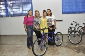 Os alunos classificados nos primeiros lugares foram presenteados com uma bicicleta e os alunos segundo lugares ganharam mochilas escolares.