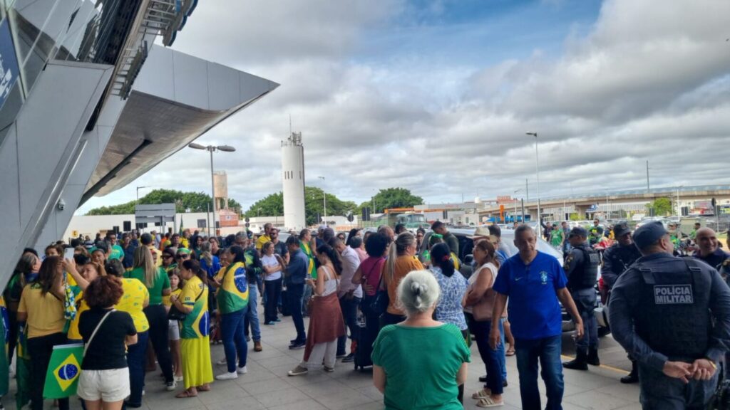 Centenas de pessoas lotaram a recepção do Aeroporto Internacional Marechal Rondon, em Várzea Grande, para recepcionar o ex-presidente Jair Bolsonaro – que cumpre agenda em Mato Grosso.