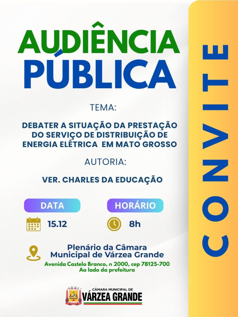 Várzea Grande recebe, nesta segunda-feira, dia 15 de dezembro de 2025 (segunda-feira), às 8h, uma audiência pública para debater a situação da prestação do serviço de distribuição de energia elétrica em Mato Grosso. A iniciativa é do deputado estadual Wilson Santos (PSD), vice-presidente da Comissão Especial da Assembleia Legislativa que trata da renovação ou de uma nova licitação da concessão de energia no estado pelos próximos 30 anos. Além disso, a audiência atende um pedido do vereador Charles da Educação ( União).
