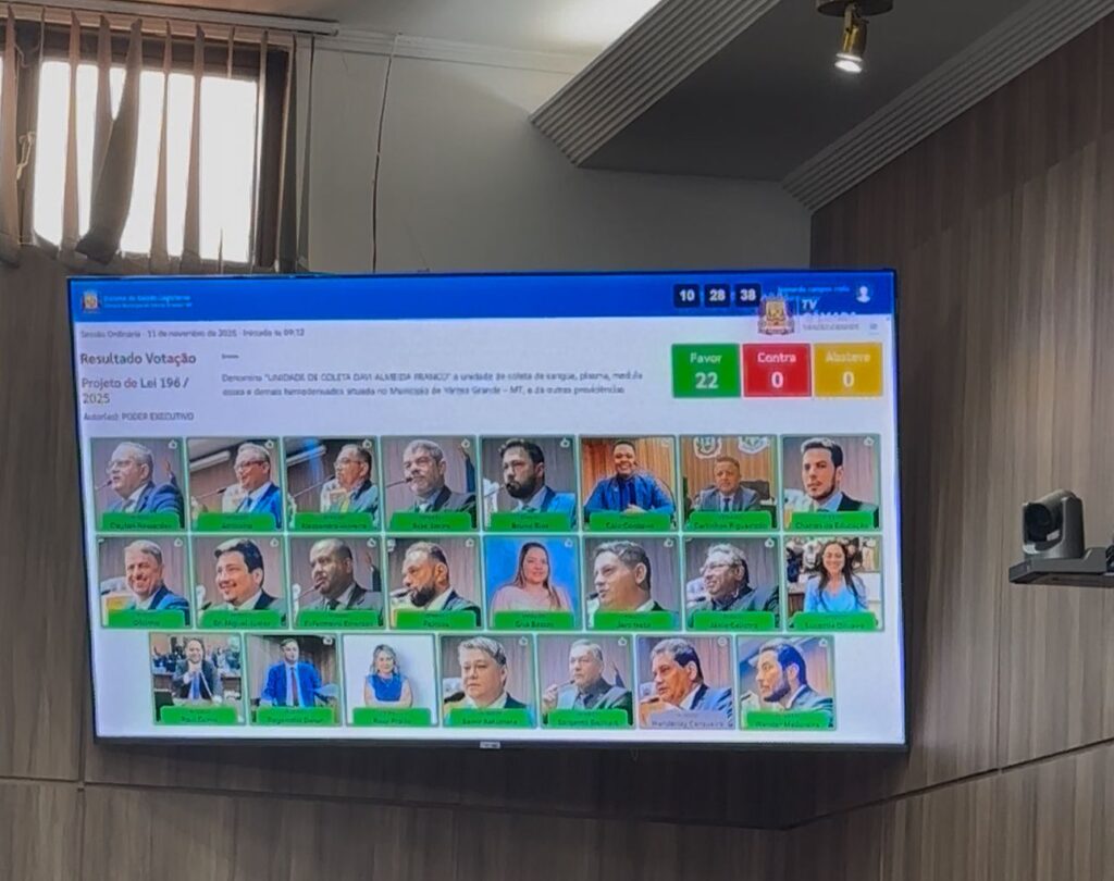 Durante a sessão ordinária desta terça-feira (11), os vereadores de Várzea Grande aprovaram, por unanimidade, o Projeto de Lei nº 196/2025, de autoria do Poder Executivo, que denomina “Unidade de Coleta Davi Almeida Franco” o prédio destinado à coleta de sangue, plasma, medula óssea e demais hemoderivados, vinculado à Secretaria Municipal de Saúde.