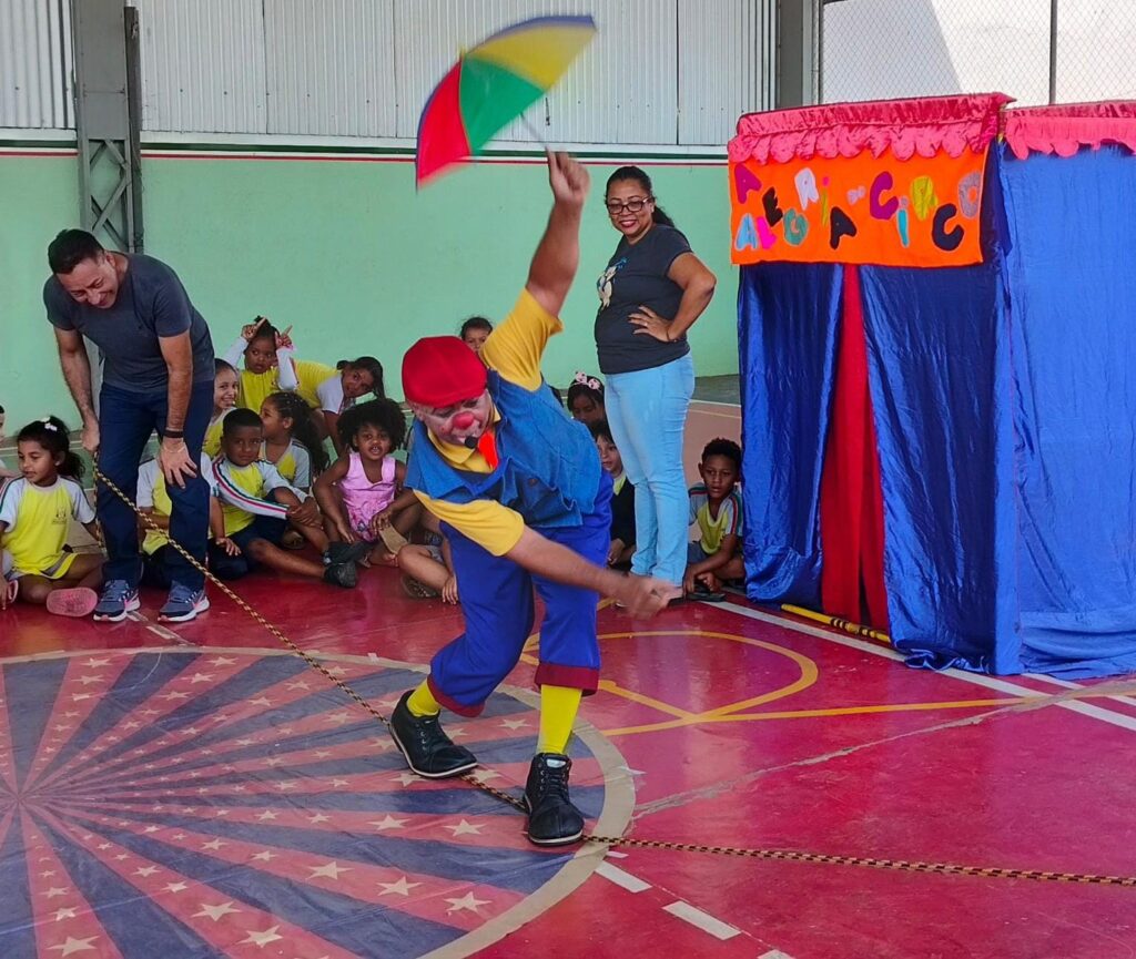 Na manhã de quinta-feira (28), a Escola Municipal de Educação Básica Padre Luiz Maria Ghisoni, no bairro Vila Arthur, em Várzea Grande, recebeu o espetáculo “A Alegria do Circo”, apresentado pelo artista João D’ Almeida.