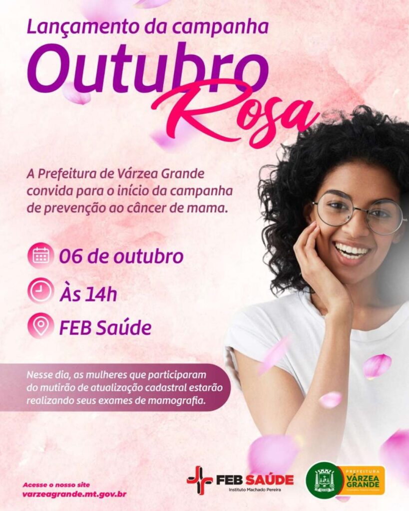 A Secretaria Municipal de Saúde de Várzea Grande realiza, na próxima segunda-feira (6), às 14h, na FEB Saúde, a abertura oficial da campanha Outubro Rosa, movimento dedicado à prevenção e ao diagnóstico precoce do câncer de mama.