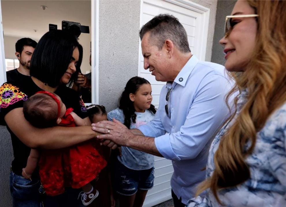 Antes da solenidade de entrega das chaves, o governador Mauro Mendes e a primeira-dama Virginia Mendes visitaram o residencial onde foram construídas as casas e conheceram duas famílias beneficiadas.