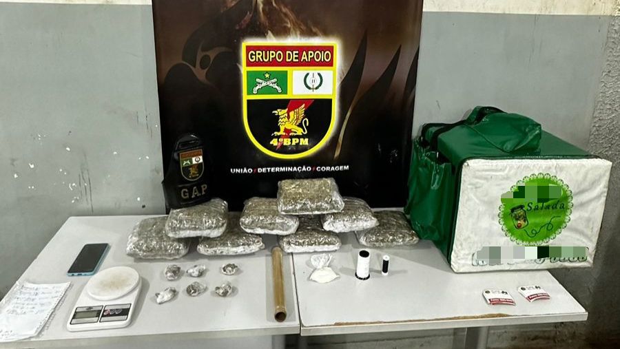 Durante patrulhamento pelo bairro Mapim, os policiais do 4º BPM receberam informações de populares sobre um homem que estaria realizando entrega de drogas pela região. Segundo as denúncias, o suspeito utilizava uma motocicleta e guardava as drogas em uma mochila, comumente utilizada por entregadores de delivery.
