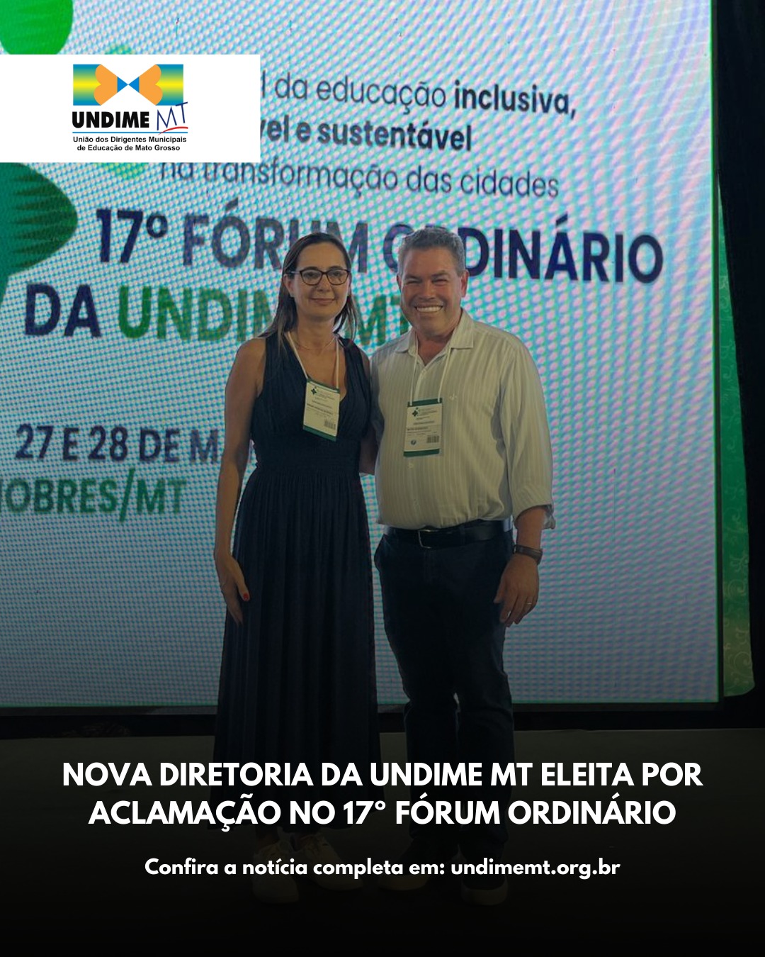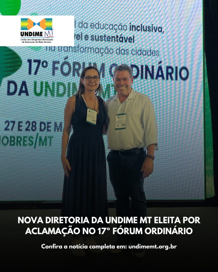 A nova diretoria da União dos Dirigentes Municipais de Educação do Estado de Mato Grosso (Undime MT) foi eleita por aclamação durante o 17º Fórum Ordinário da seccional, realizado nos dias 27 e 28 de março de 2025, na cidade de Nobres/MT. A chapa “Por Uma Educação Inclusiva, Acessível e Sustentável” foi aclamada por unanimidade, confirmando a continuidade do trabalho com foco na transformação educacional e social do estado.