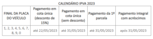 Além da mudança no calendário, o Governo do Estado aumentou o desconto concedido nos pagamentos à vista. Quem realizar o pagamento do IPVA em cota única até o dia 22 de maio tem direito a um desconto de 15% no valor. Antes esse desconto era de, no máximo, 5%.
