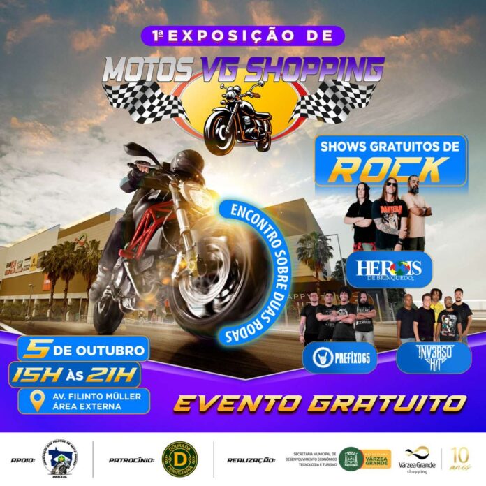 Uma programação que promete movimentar o domingo em Várzea Grande. No dia 5 de outubro, das 15h às 21h, a cidade recebe a 1ª Exposição de Motos, encontro inédito que reúne fãs das duas rodas, colecionadores e famílias em busca de lazer, com shows ao vivo e muita diversão. O evento será realizado na rua lateral do Várzea Grande Shopping, na Avenida Filinto Müller, com entrada gratuita.