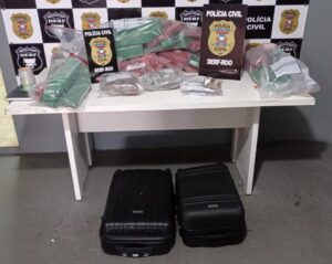A Delegacia Especializada de Roubos e Furtos de Rondonópolis apreendeu na manhã desta segunda-feira (01.05), 55 tabletes de maconha e pacotes de skunk, conhecida como ‘supermaconha’. Uma pessoa foi presa em flagrante com o entorpecente e dezenas de materiais usados para embalar e pesar a droga.