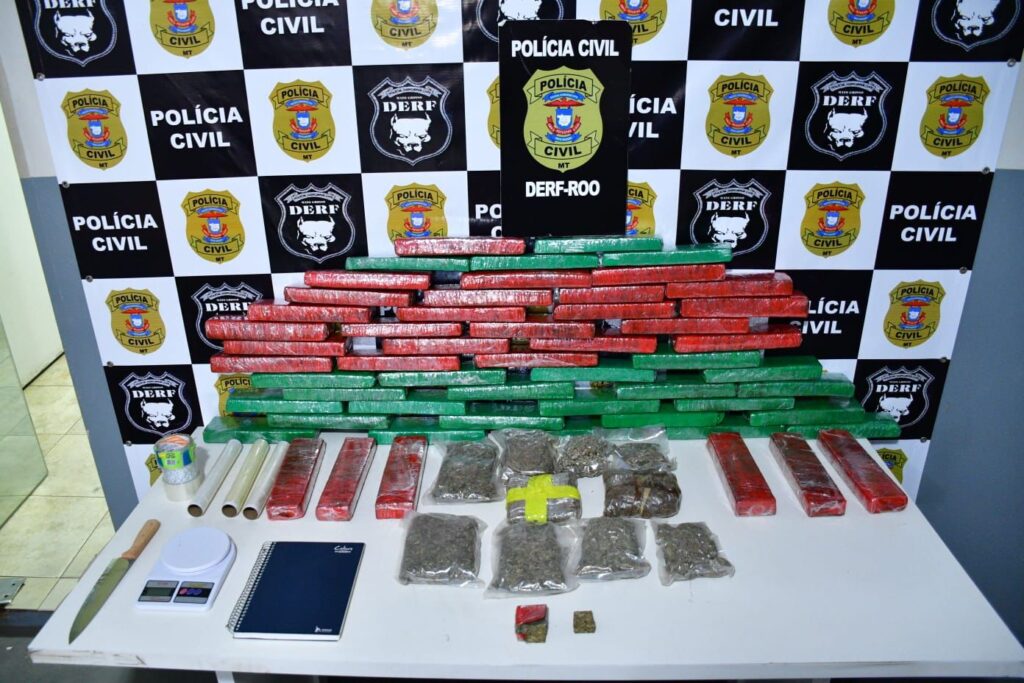 A Delegacia Especializada de Roubos e Furtos de Rondonópolis apreendeu na manhã desta segunda-feira (01.05), 55 tabletes de maconha e pacotes de skunk, conhecida como ‘supermaconha’. Uma pessoa foi presa em flagrante com o entorpecente e dezenas de materiais usados para embalar e pesar a droga.