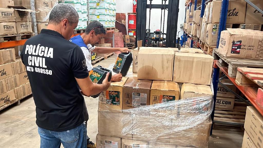 Polícia Civil e ANP apreendem mais de 13 mil litros de óleo lubrificante sem procedência em Cuiabá.