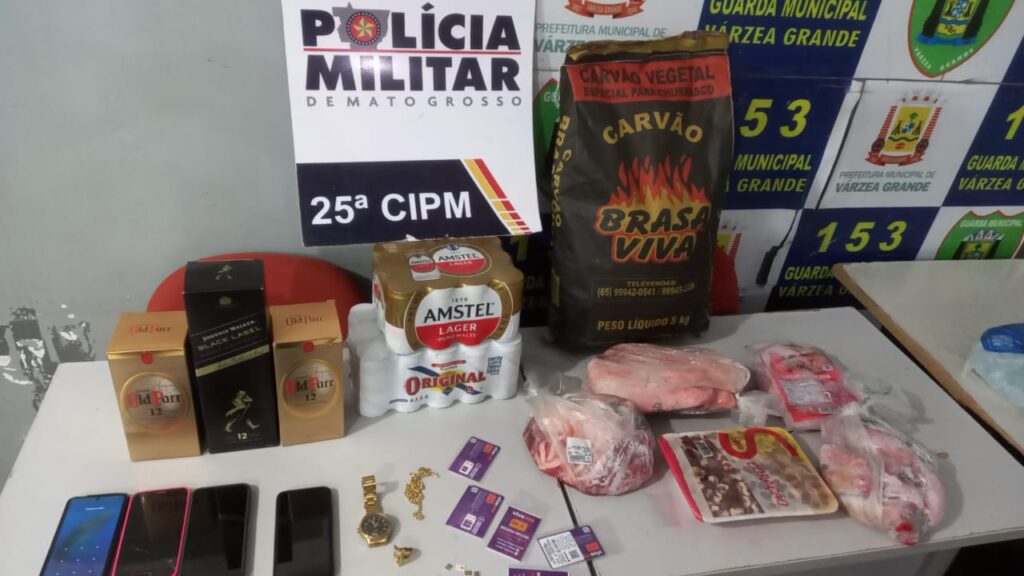 Na ação, os policiais militares da 25ª Companhia Independente apreenderam 6 kg de carne, caixas de cervejas, um pacote de carvão e quatro aparelhos de celular que tinham sido levados com o golpe, ou seja, não tinham sido pagos.