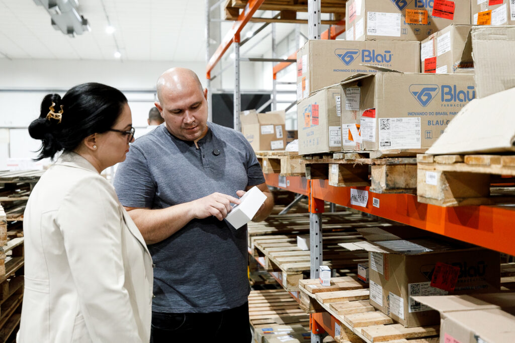 A imagem mostra o prefeito Abilio Brunini olhando uma caixa de medicamento, apontando informações da embalagem para a primeira-dama e vereadora Samantha Iris. Eles estão em um galpão de estoque.