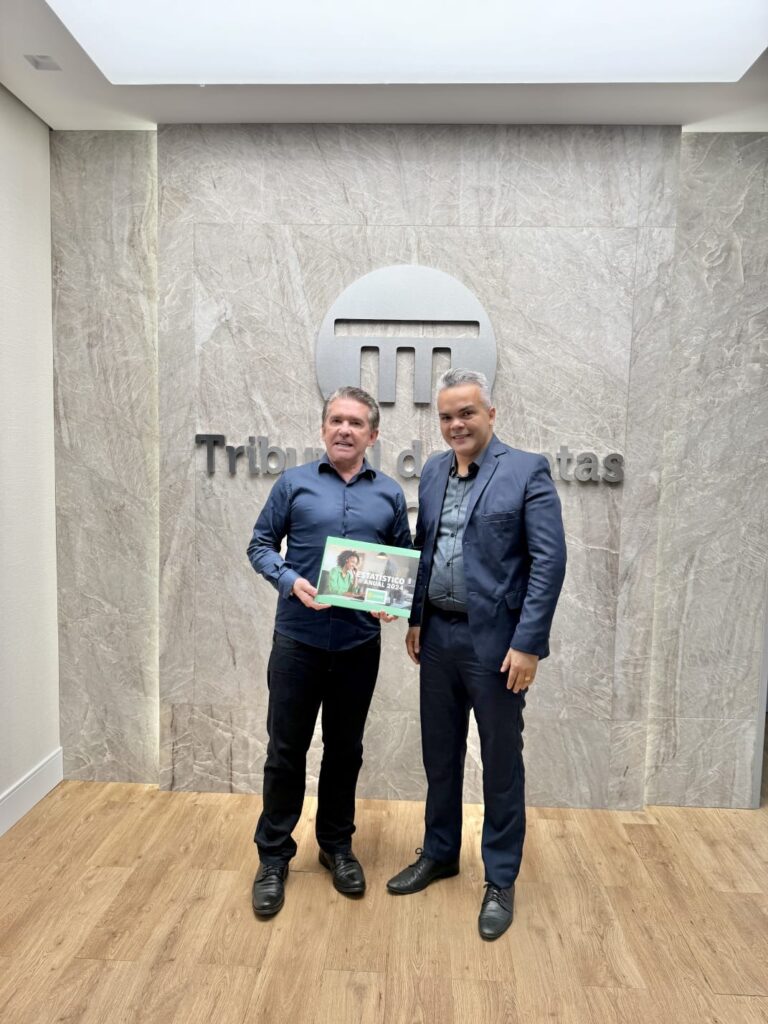 A foto mostra o conselheiro e presidente do Tribunal de Contas do Estado, Sérgio Ricardo, recebendo o Relatório Estatístico Anual da Ouvidoria Geral do Município (OGM).
