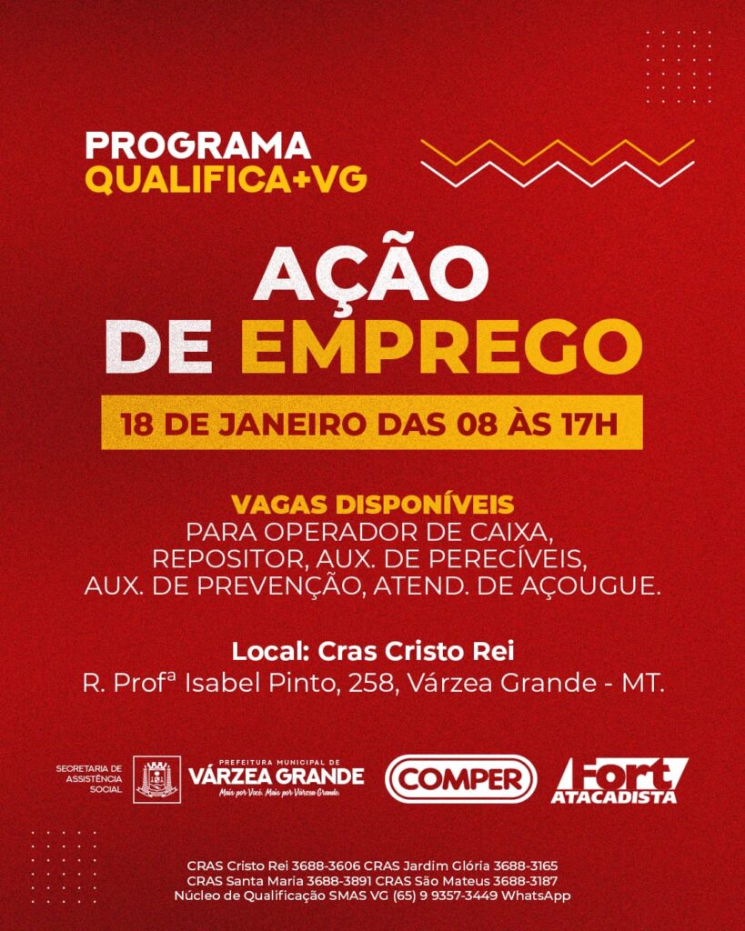 Será no dia 18 de janeiro (quinta-feira), das 08h às 17h no CRAS Cristo Rei em Várzea Grande.