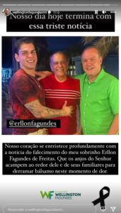 A deputada Janaína Riva também usou as redes para lamentar a morte do primo do marido “Precocemente, vítima de um infarto, Erllon nos deixa sua lembrança de carinho, alegria e amizade. Estamos com os corações partidos, mas certos de que ele já está ao lado do nosso Pai”.